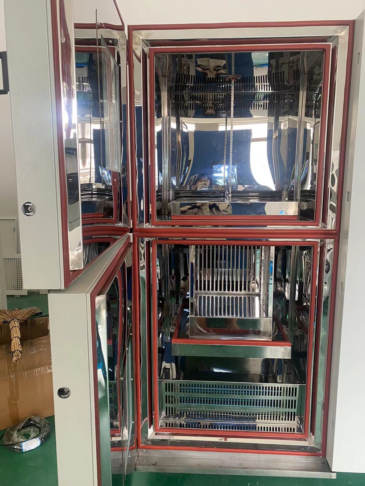 2.另外的一部分水,屬于測試區(qū)的設計問題,有些廠家生產的兩箱式冷熱沖擊試驗箱,排放熱能是通過在測試區(qū)對外開啟閥門抽風,以降低試驗室內的熱量,這樣做高、低溫沖擊時,測試區(qū)內的高溫能量或者低溫能量都被排放到室外,這樣雖然達到了降低蓄能組件成本的目的,但是試驗室內會引入大量水分,也必然造成預冷區(qū)結霜。
