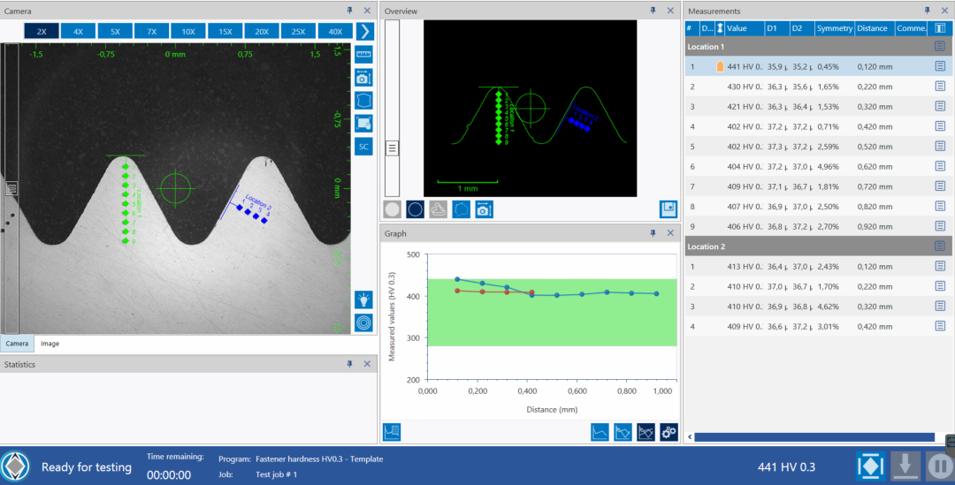 顯示了應(yīng)進(jìn)行壓痕測(cè)試的位置,以及實(shí)際的洛氏測(cè)試