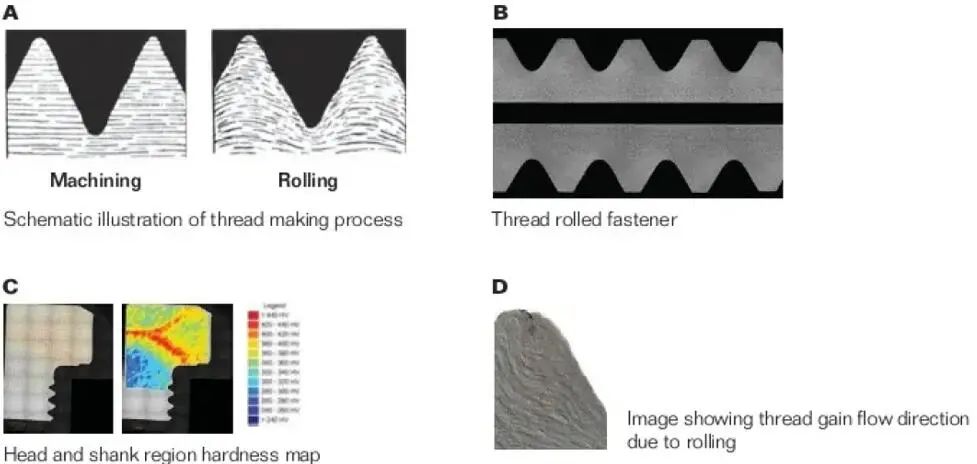 此外,螺紋滾壓工藝作為一種常見(jiàn)的強(qiáng)化方法,與螺紋加工緊固件或未滾壓螺紋的熱處理緊固件相比,滾壓工藝可將材料強(qiáng)度提高至少25%,并且具有將疲勞強(qiáng)度提高75%的額外優(yōu)勢(shì)??梢赃M(jìn)行硬度測(cè)試來(lái)判定這些方法的不同。