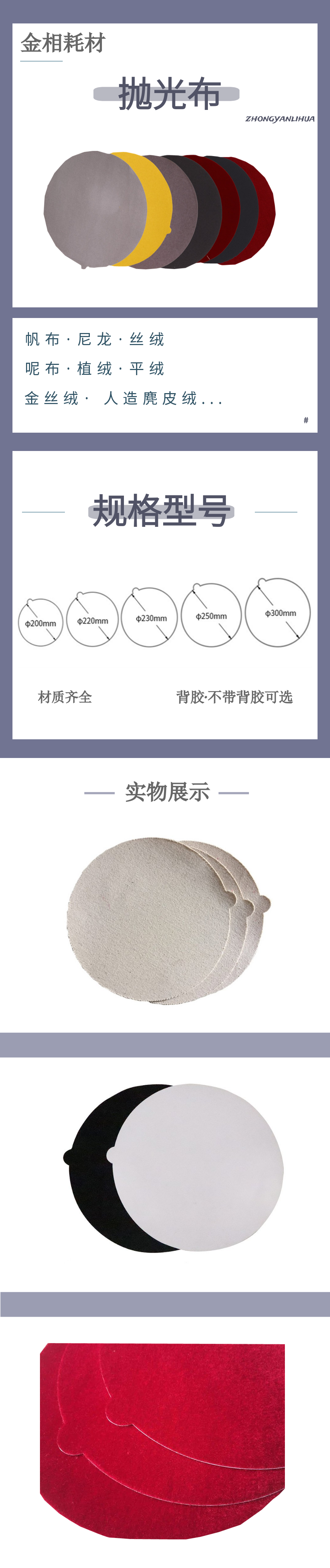 1.無膠普通使用時,直接放置在拋光盤上,用壓圈扣住即可 2.帶膠粘貼拋光盤使用,可將拋光織物直接固定在拋盤上,采用高檔壓敏膠制成,拋光布平整, |