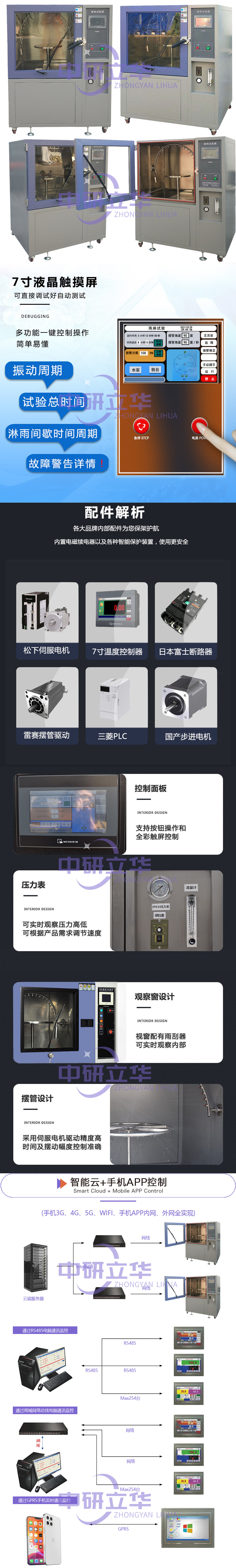 2.全儀表的控制系統(tǒng)以及變頻技術(shù)的采用,使得降雨量、試品架的回轉(zhuǎn)角度,噴水?dāng)[桿的擺動角度以及噴水量,擺動頻率都可自由設(shè)置及調(diào)節(jié)